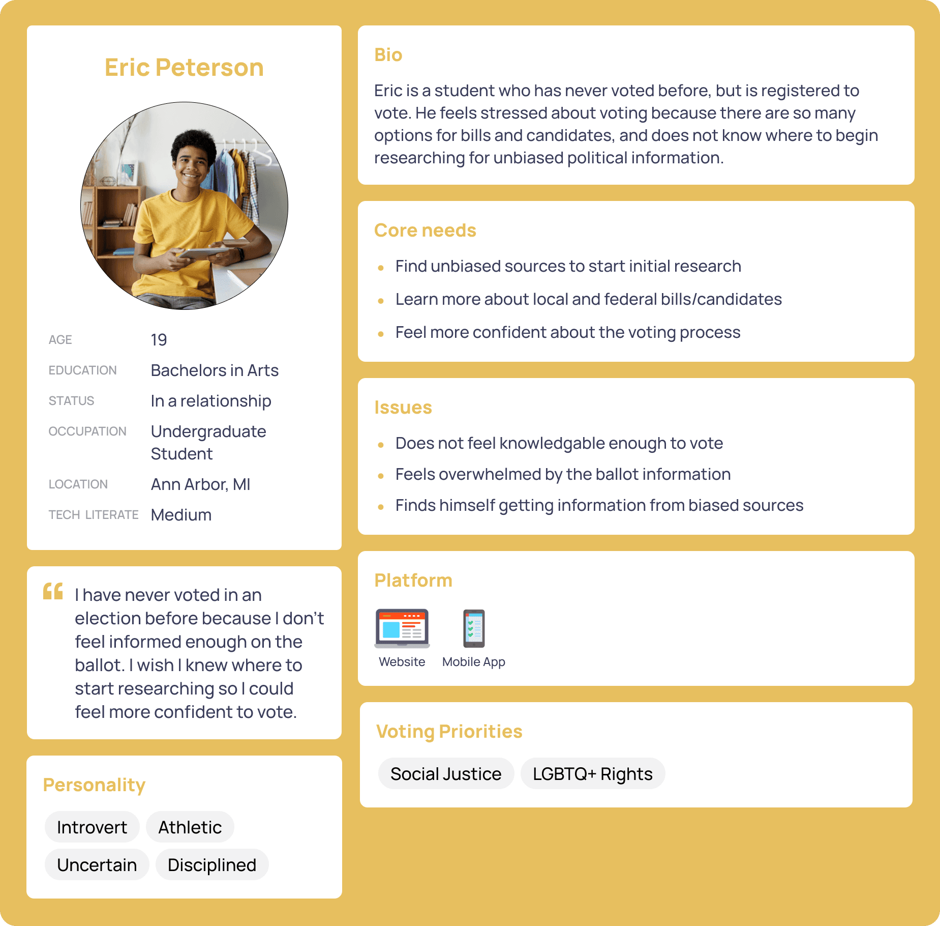 We conducted 15 interviews asking first-time and experienced voters about their experience during election seasons and how they prepare for them. We also interviewed Larry Kestenbaum, the County Clerk and Register of Deeds for Washtenaw County. Some insights we gathered from those interviews are…